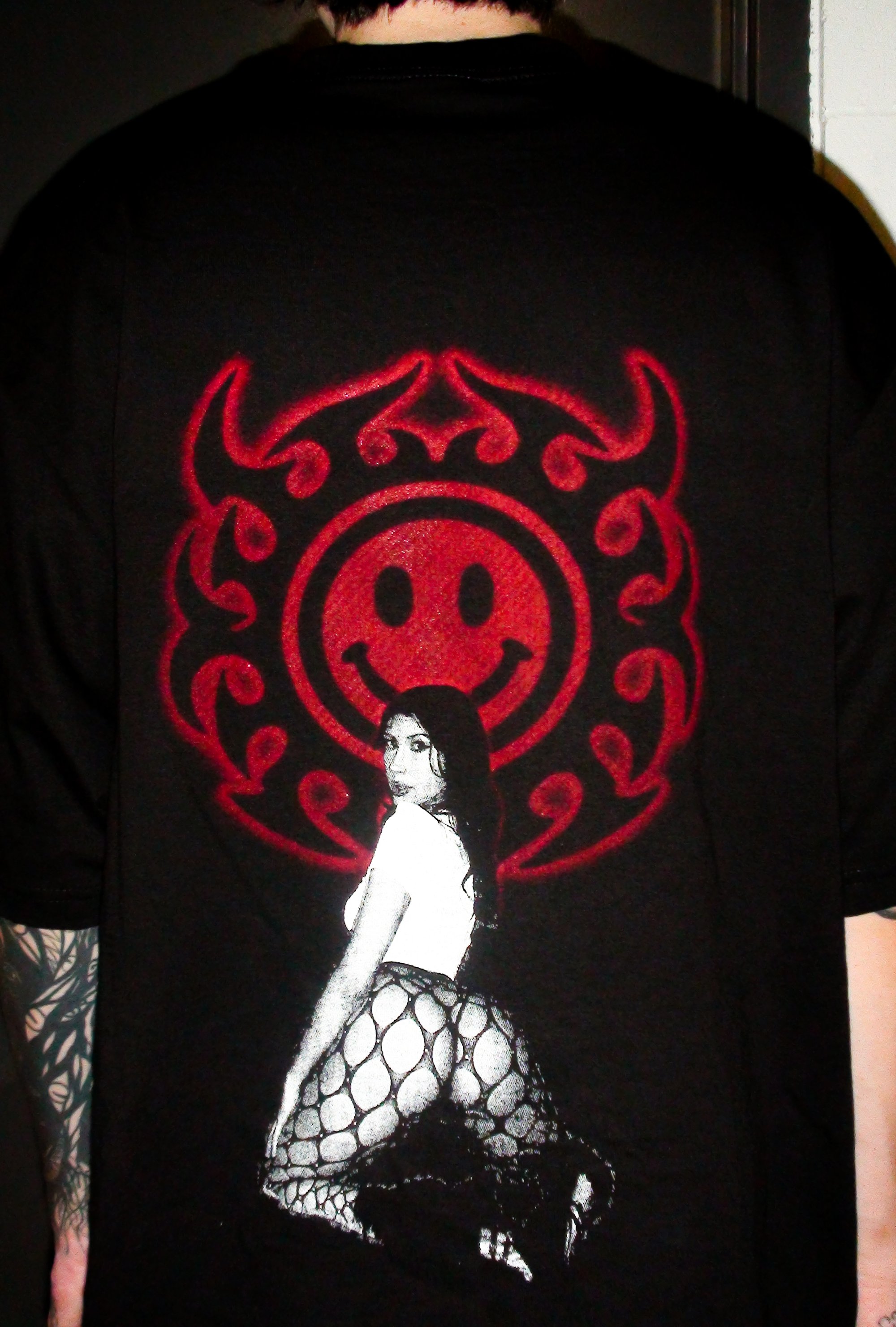 The back burns with a sigil—part sacred, part satanic—behind her crouched form. Like a VHS tape that warps the longer you stare.